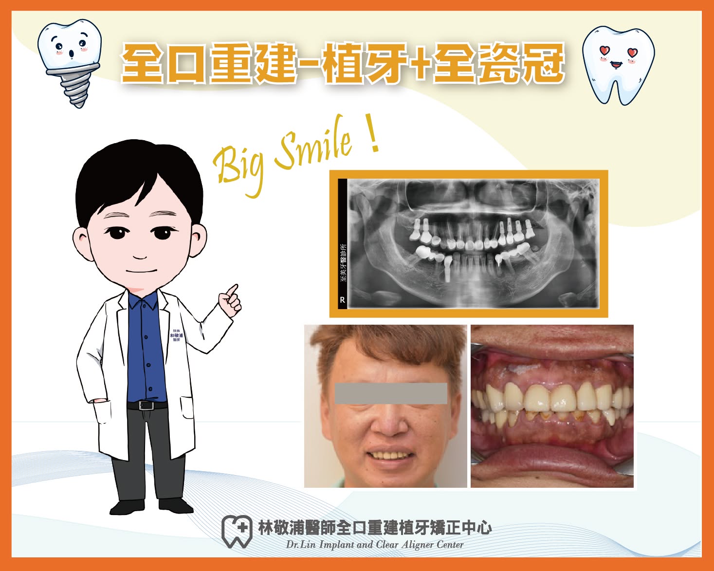 新的牙齒狀態看來非常自然美觀,完全看不出來是假牙,使他可以重拾自信大方笑容,賴先生非常滿意這次全口重建手術。