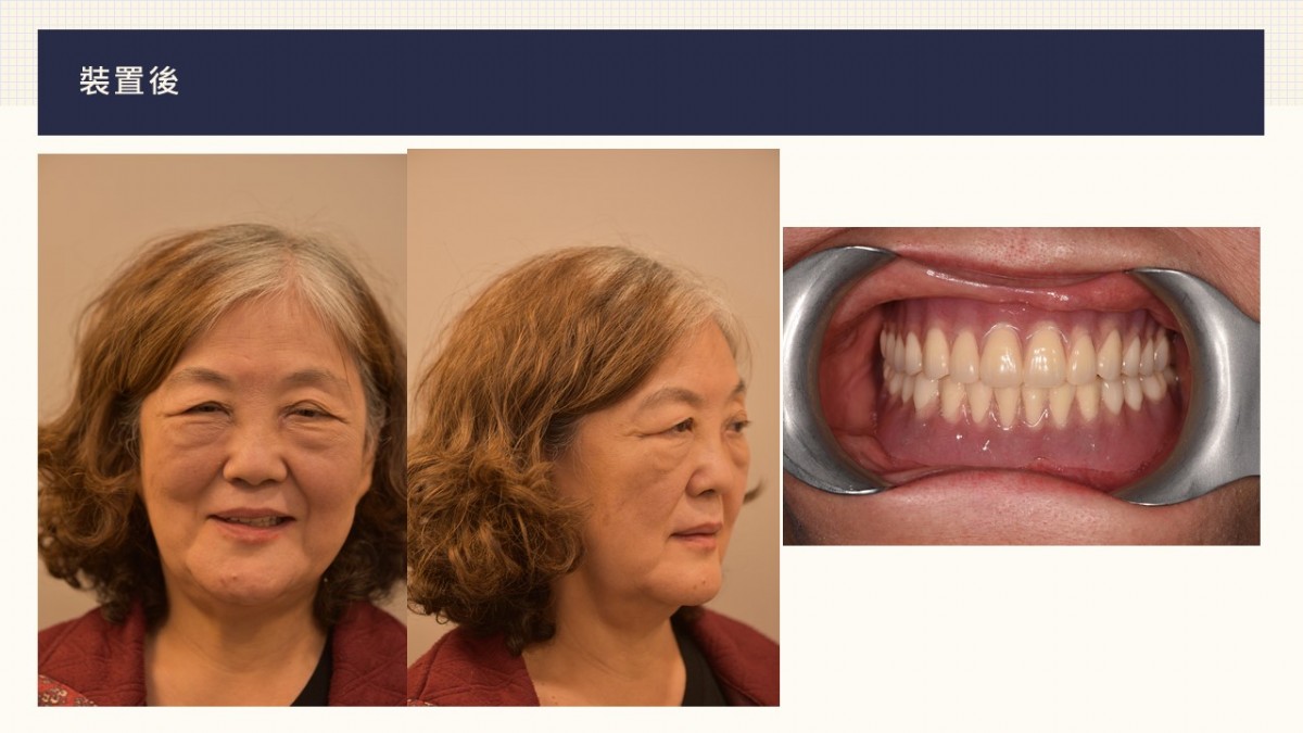 因缺牙許久的王小姐,來院進行上下植牙各兩顆,並製作上下全口活動假牙,不僅使用度佳,又恢復美觀,親朋好友都覺得年輕數十歲,讚嘆院長的技術。